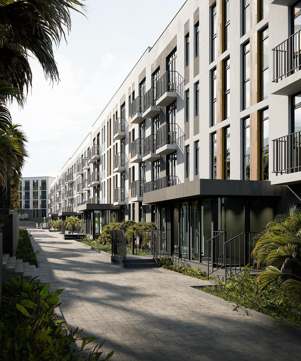 Жилой комплекс самодостаточен — на территории присутствуют магазины, кафе, спа-комплекс, подогреваемый бассейн, спортивные и игровые площадки, прогулочные зоны. В нескольких минутах ходьбы — песчаный пляж с собственным спуском и защитной сеткой от медуз. Отличительная особенность — дворы без машин. Территория спроектирована таким образом, что зоны для отдыха и спорта, площадки для детей расположены с одной стороны, а паркинг — с другой.