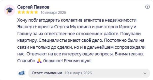 ЗаботаХочу поблагодарить коллектив агентства недвижимости Эксперт+ юриста Сергея Мутовина и риелторов Ирину и Галину за их ответственное отношение к работе. Покупали квартиру. Специалисты знают свое дело. Постоянно были на связи не только до сделки, но и в дальнейшем сопровождали нас. Отвечают на все интересующие вопросы. Внимательны. Спасибо большое! Рекомендую!