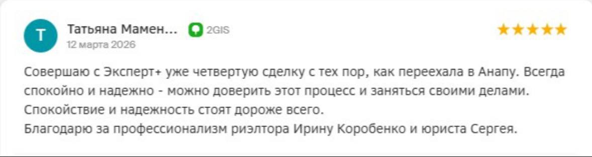 ЗаботаСовершаю с Эксперт+ уже четвертую сделку с тех пор, как переехала в Анапу. Всегда спокойно и надежно - можно доверить этот процесс и заняться своими делами.