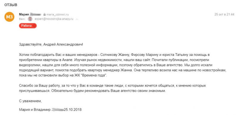 Хотим поблагодарить Вас и ваших менеджеров - Сотникову Жанну, Фирсову Марину и юриста Татьяну за помощь в приобретении квартиры в Анапе. Изучая рынок недвижимости, нашли ваш сайт. Почитали публикации, посмотрели видеоролики, нашли для себя много полезной информации, поэтому обратились в Ваше агентство.