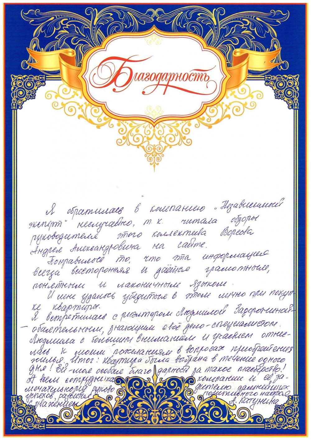 Я встретилась с риэлтором Людмилой Задорожиной ‒ обаятельным, знающим свое дело ‒ специалистом. Людмила с большим вниманием и участием отнеслась к моим пожеланиям в вопросах приобретения жилья. Итог: квартира была выбрана в течении одного дня! Ей ‒ моя особая благодарность за такое мастерство! А всем сотрудникам компании и ее замечательному руководителю дальнейших успехов, развития, позитивного настроя!
