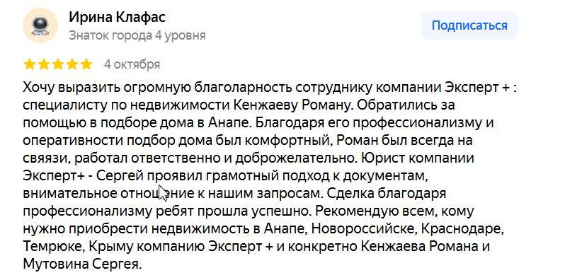 ЗаботаХочу выразить огромную благоларность сотруднику компании Эксперт + : специалисту по недвижимости Кенжаеву Роману. Обратились за помощью в подборе дома в Анапе. Благодаря его профессионализму и оперативности подбор дома был комфортный, Роман был всегда на свяязи, работал ответственно и доброжелательно. Юрист компании Эксперт+ - Сергей проявил грамотный подход к документам, внимательное отношение к нашим запросам. Сделка благодаря профессионализму ребят прошла успешно. Рекомендую всем, кому нужно приобрести недвижимость в Анапе, Новороссийске, Краснодаре, Темрюке, Крыму компанию Эксперт + и конкретно Кенжаева Романа и Мутовина Сергея.