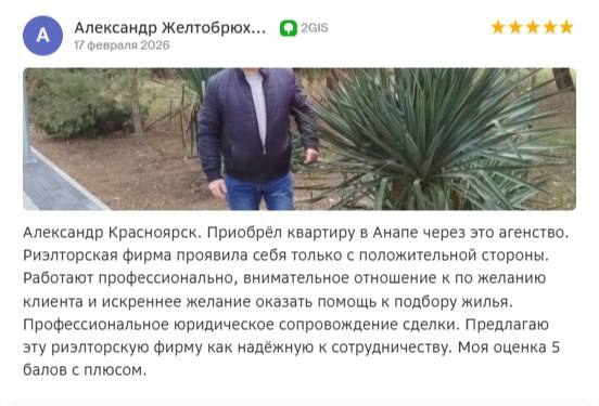 ЗаботаАлександр Красноярск. Приобрёл квартиру в Анапе через это агенство. Риэлторская фирма проявила себя только с положительной стороны. Работают профессионально, внимательное отношение к по желанию клиента и искреннее желание оказать помощь к подбору жилья. Профессиональное юридическое сопровождение сделки. Предлагаю эту риэлторскую фирму как надёжную к сотрудничеству. Моя оценка 5 балов с плюсом. Особенно хочу отметить работу сотрудников фирмы Эйснера Д. Р. и Мутовина С. В. и выразить благодарность.