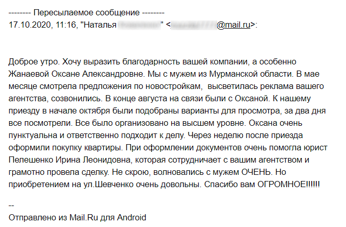 ЗаботаДоброе утро. Хочу выразить благодарность вашей компании, а особенно Жанаевой Оксане Александровне. Мы с мужем из Мурманской области. В мае месяце смотрела предложения по новостройкам, высветилась реклама вашего агентства, созвонились. В конце августа на связи были с Оксаной. К нашему приезду в начале октября были подобраны варианты для просмотра, за два дня все посмотрели. Все было организовано на высшем уровне. Оксана очень пунктуальна и ответственно подходит к делу. Через неделю после приезда оформили покупку квартиры. При оформлении документов очень помогла юрист Пелешенко Ирина Леонидовна, которая сотрудничает с вашим агентством и грамотно провела сделку. Не скрою, волновались с мужем ОЧЕНЬ. Но приобретением на ул.Шевченко очень довольны.