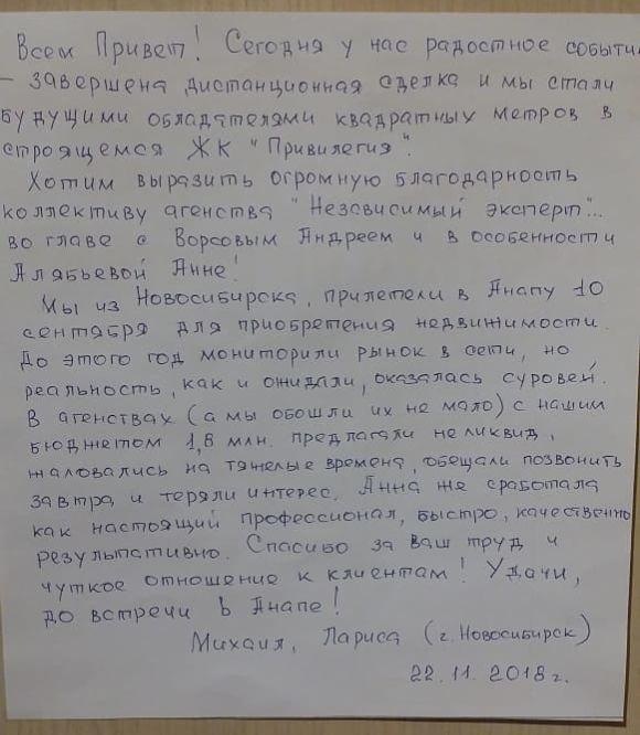 Мы из Новосибирска, прилетели в Анапу 10 сентября для приобретения недвижимости. До этого год мониторили рынок в сети, но реальность, как и ожидали, оказалась суровей. В агентствах (а мы обошли их не мало) с нашим бюджетом 1,8 млн предлагали неликвид, жаловались на тяжелые времена, обещали позвонить завтра и теряли интерес. Анна же сработала как настоящий профессионал, быстро, качественно, результативно. Спасибо за Ваш труд и чуткое отношение к клиентам! Удачи.