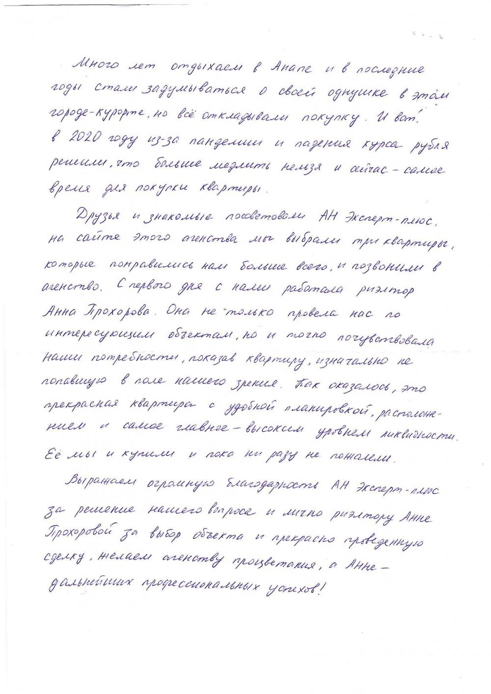 Выражаем огромную благодарность АН Эксперт-плюс за решение нашего вопроса и лично риэлтору Анне Прохоровой за выбор объекта и прекрасно проведенную сделку, желаем агентству процветания, а Анне — дальнейших профессиональных успехов.