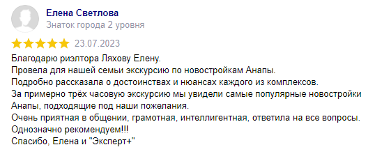 ЗаботаБлагодарю риэлтора Ляхову Елену. Провела для нашей семьи экскурсию по новостройкам Анапы. Подробно рассказала о достоинствах и нюансах каждого из комплексов. За примерно трёхчасовую экскурсию мы увидели самые популярные новостройки Анапы, подходящие под наши пожелания.