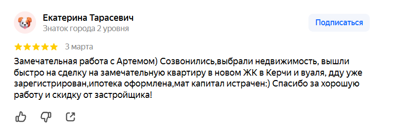 ЗаботаЗамечательная работа с Артемом) Созвонились,выбрали недвижимость, вышли быстро на сделку на замечательную квартиру в новом ЖК в Керчи и вуаля, дду уже зарегистрирован,ипотека оформлена,мат капитал истрачен:) Спасибо за хорошую работу и скидку от застройщика!