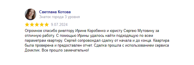 С помощью Ирины удалось найти подходящую по всем параметрам квартиру. Сергей сопровождал сделку от начала и до конца.