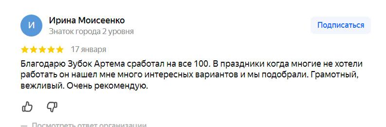 Благодарю Зубок Артема - сработал на все 100. В праздники. когда многие не хотели работать, он нашел мне много интересных вариантов, и мы подобрали. Грамотный, вежливый. Очень рекомендую.