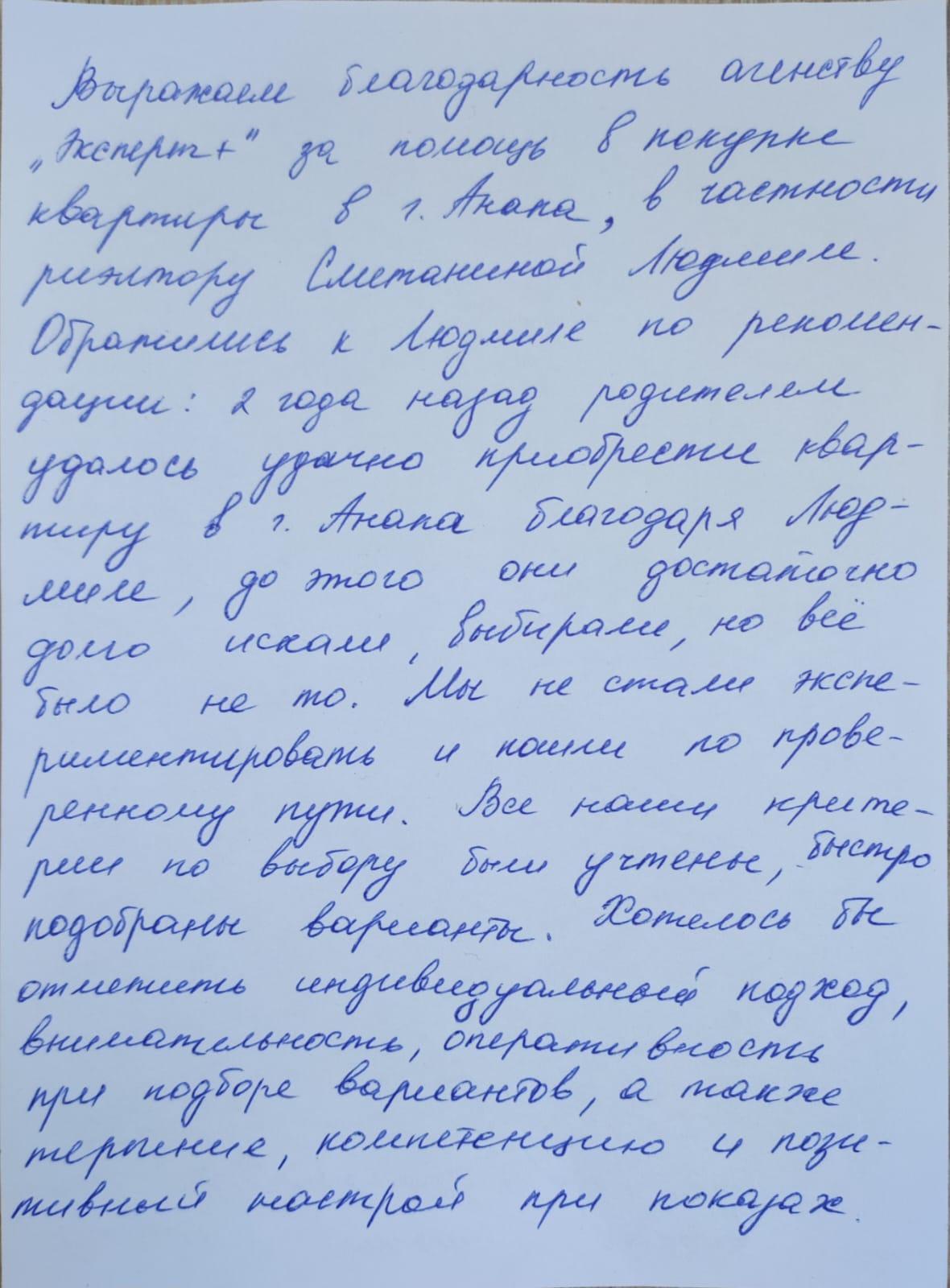 Обратились к Людмиле по рекомендации: 2 года назад родителям удалось удачно приобрести квартиру в г. Анапа благодаря Людмиле, до этого они достаточно долго искали, выбирали, но все было не то. Мы не стали экспериментировать и пошли по проверенному пути. Все наши критерии по выбору были учтены, быстро подобрали варианты. Хотелось бы отметить индивидуальный подход, внимательность, оперативность при подборе вариантов, а также терпение, компетенцию и позитивный настрой при показах.