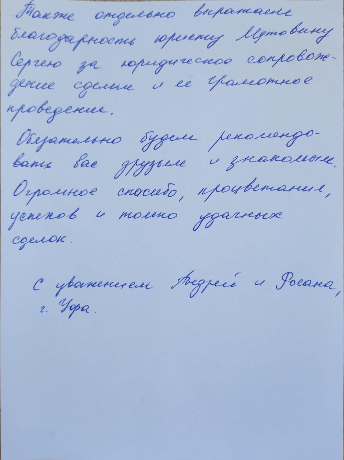 Также отдельно выражаю благодарность юристу Мутовину Сергею за юридическое сопровождение сделки и её грамотное проведение..