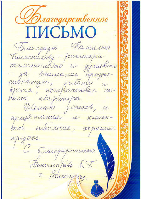 Благодарю Наталью Колясникову ‒ риэлтора талантливого и душевного ‒ за внимание, профессионализм, заботу и время, потраченное на поиск квартиры.