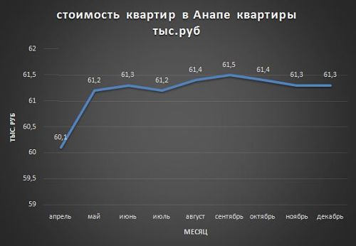 Не смотря на то, что спрос на недвижимость Анапы в декабре 2015 годы был высокий, это не подстегнуло рост цен на вторичном рынке квартир Анапы. Вместе с тем и о падении не было и речи. Небольшие колебания в течение месяца не оказали влияния на общую картину, цены в декабре 2015 года на квартиры на вторичном рынке Анапы остались на ноябрьском уровне – 61,3 тыс.кв.м.