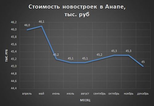 Как я и предполагал, в декабре стоимость новостроек снизилась. Но то, что снижение окажется столь внушительным, для меня оказалось неожиданным. График опустился до 45 тысяч рублей за квадратный метр. Таких низких цен на новостройки Анапы я не фиксировал еще ни разу.