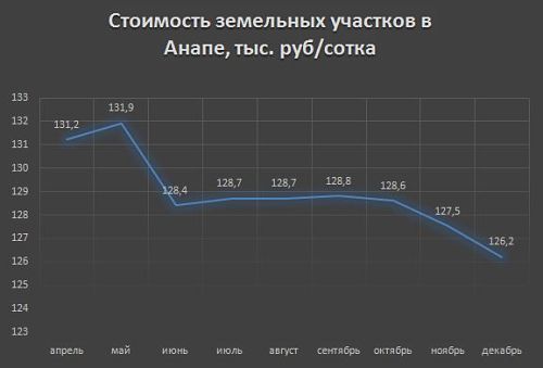 Непосредственно в Анапе и в местах поближе к морю, стоимость сотки колеблется, в среднем, от 800 тысяч до 1 миллиона. Как говорится, почувствуйте разницу! Цифра на графике в 126,2 тысячи рублей, это, скорее, как средняя температура по больнице. Но устойчивая динамика к снижению цен на участки, это объективный показатель, который не стоит игнорировать.