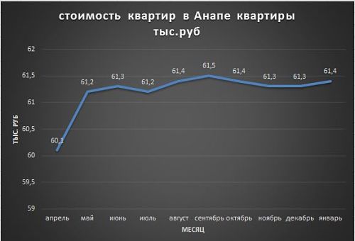 Много это или мало? Посмотрев на график можно понять, что это просто те колебания, которые можно назвать статистической погрешностью, которая не играет ни какой роли. Мы видим, что практически за год наших наблюдений цены на квартиры на вторичном рынке Анапы, остаются неизменными.
