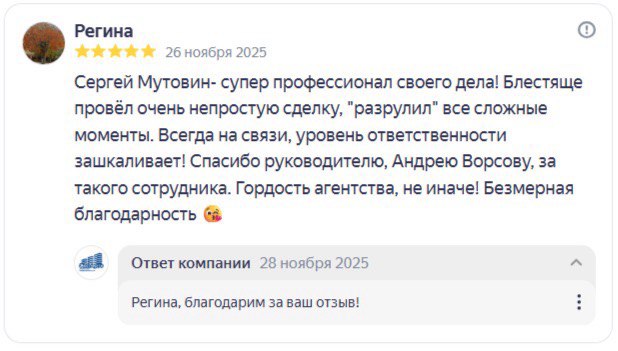 Сергей Мутовин- супер профессионал своего дела! Блестяще провёл очень непростую сделку, "разрулил" все сложные моменты. Всегда на связи, уровень ответственности зашкаливает! Спасибо руководителю, Андрею Ворсову, за такого сотрудника. Гордость агентства, не иначе! Безмерная благодарность ?