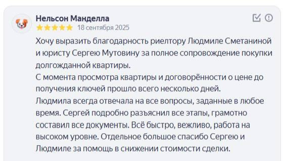ЗаботаХочу выразить благодарность риелтору Людмиле Сметаниной и юристу Сергею Мутовину за полное сопровождение покупки долгожданной квартиры. С момента просмотра квартиры и договорённости о цене до получения ключей прошло всего несколько дней. Людмила всегда отвечала на все вопросы, заданные в любое время. Сергей подробно разъяснил все этапы, грамотно составил все документы. Всё быстро, вежливо, работа на высоком уровне. Отдельное большое спасибо Сергею и Людмиле за помощь в снижении стоимости сделки.
