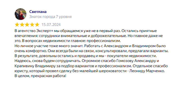 Огромное спасибо Гомозову Александру и Крапивину Владимиру за подбор вариантов и профессионализм. Отдельное спасибо юристу, который провел сделку без малейшей шероховатости - Леониду Марченко.