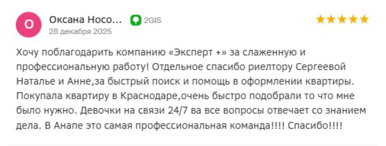 ЗаботаХочу поблагодарить компанию «Эксперт +» за слаженную и профессиональную работу! Отдельное спасибо риелтору Сергеевой Наталье и Анне,за быстрый поиск и помощь в оформлении квартиры. Покупала квартиру в Краснодаре,очень быстро подобрали то что мне было нужно. Девочки на связи 24/7 ва все вопросы отвечает со знанием дела. В Анапе это самая профессиональная команда!!!! Спасибо!!!!