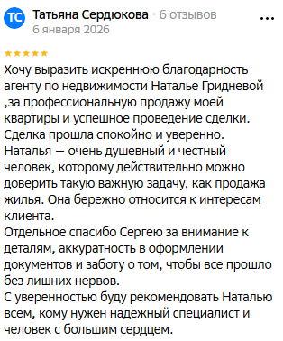 Наталья — очень душевный и честный человек, которому действительно можно доверить такую важную задачу, как продажа жилья. Она бережно относится к интересам клиента.