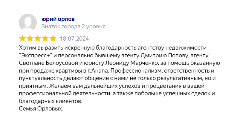 ЗаботаХотим выразить искреннюю благодарность агентству недвижимости "Эксперт+" и персонально бывшему агенту Дмитрию Попову, агенту Светлане Белоусовой и юристу Леониду Марченко, за помощь, оказанную при продаже квартиры в г. Анапа.