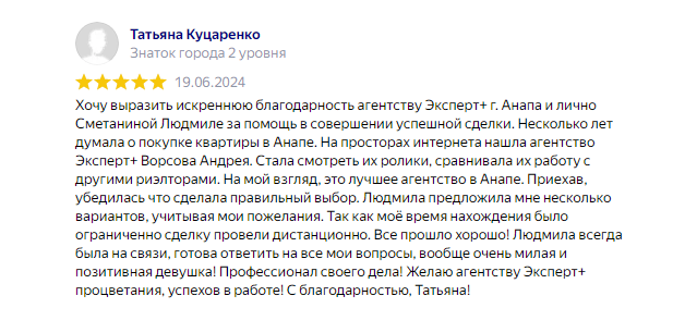 Несколько лет думала о покупке квартиры в Анапе. На просторах интернета нашла агентство Эксперт+ Ворсова Андрея. Стала смотреть их ролики, сравнивала их работу с другими риэлторами.