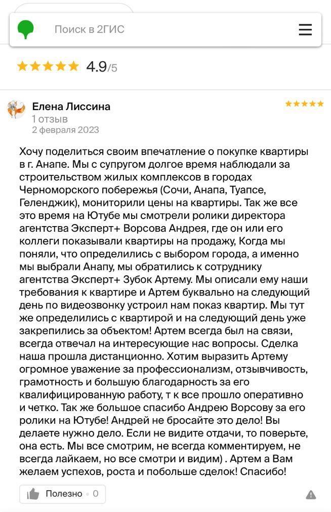 Когда мы поняли, что определились с выбором города, а именно мы выбрали Анапу, мы обратились к сотруднику агентства "Эксперт+" Зубок Артёму. Мы описали ему наши требования к квартире и Артём буквально на следующий день по видеозвонку устроил нам показ квартир. Мы тут же определились с квартирой и на следующий день уже закрепились за объектом!