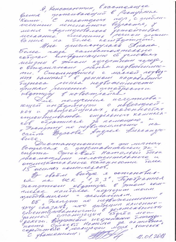 Об «Эксперте по недвижимости» хочу сказать, что принцип клиентоориентированности в деятельности данной организации сберег мои деньги. Выражаю искреннюю благодарность Сергеевой Наталье за активное содействие в реализации моих «хотелок».