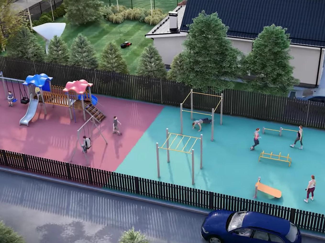 В поселке предусмотрено асфальтирование внутренних дорог, благоустройство и озеленение, возведение детских и тренажерных площадок, прогулочных зон.