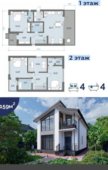 Концепция застройки подразумевает несколько типовых проектов коттеджей, отличающихся по площади (от 65 до 165 кв.м) и этажности и этажности (одно- и двухэтажные).