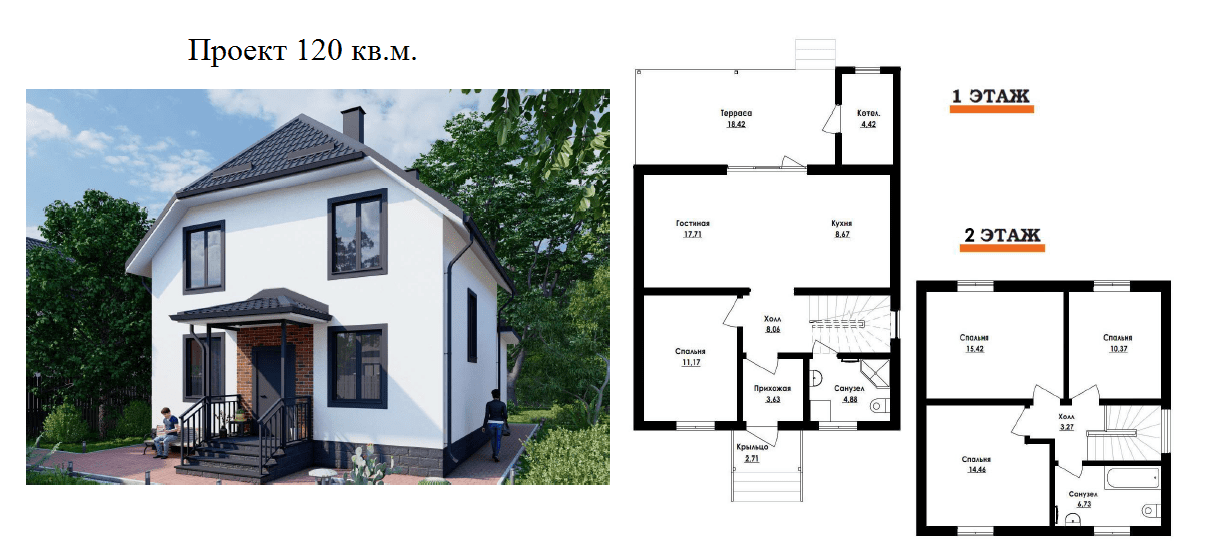 Застройщик - строительная компания "Проф-Строй". При покупке есть возможность выбрать один из нескольких проектов домов от 65 до 122 кв.м., выполненных в едином архитектурном стиле (визуализация и планировки представлены в галерее в конце статьи).