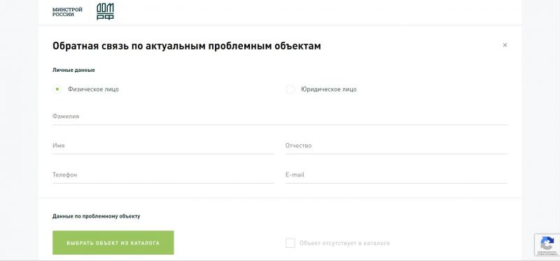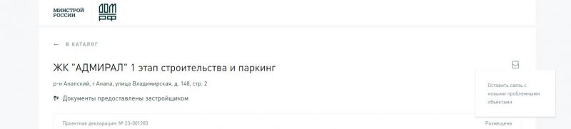 На этом можно было бы и закончить обзор сайта, но есть еще небольшая иконка в правом верхнем углу сайта. Обратите на неё внимание «Оставить связь с новыми проблемными объектами». Кликнув по ней, вы попадаете на форму обратной связи, на которой можете сообщить о той или иной проблеме с данной стройкой.