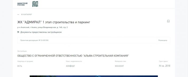 По конкретному ЖК «Адмирал» я вижу, что срок сдачи дома 4 квартал 2018 года, но то, что дом еще не сдан в эксплуатацию, причины задержки и предполагаемый новый срок сдачи не указаны.