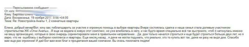 Елена, добрый вечер! Вот, хочу вас поблагодарить за участие и огромную помощь в выборе квартиры. Вчера состоялась сделка и наша семья стала долевым участником строительства ЖК «Огни Анапы»... Я еще не видела в живую этот комплекс, но уже влюбилась в него, и как будто время специально всё так выстроило, чтоб я наткнулась именно на вашу организацию, которые в свою очередь сориентировали меня в правильном направлении.... Да, дом только начался строиться и еще будет строиться больше двух лет, но я верю, что не ошиблась с выбором комплекса и квартиры. Еще месяц назад, я даже не могла подумать, что реально ,что то купить вот так, даже ни разу не видя дом. Спасибо вам еще раз огромное! И дай Бог вам всех благ и процветания вашей компании. Вы очень помогаете людям!