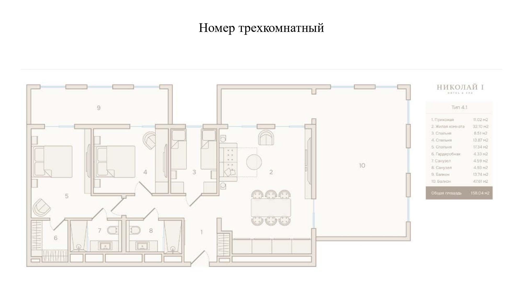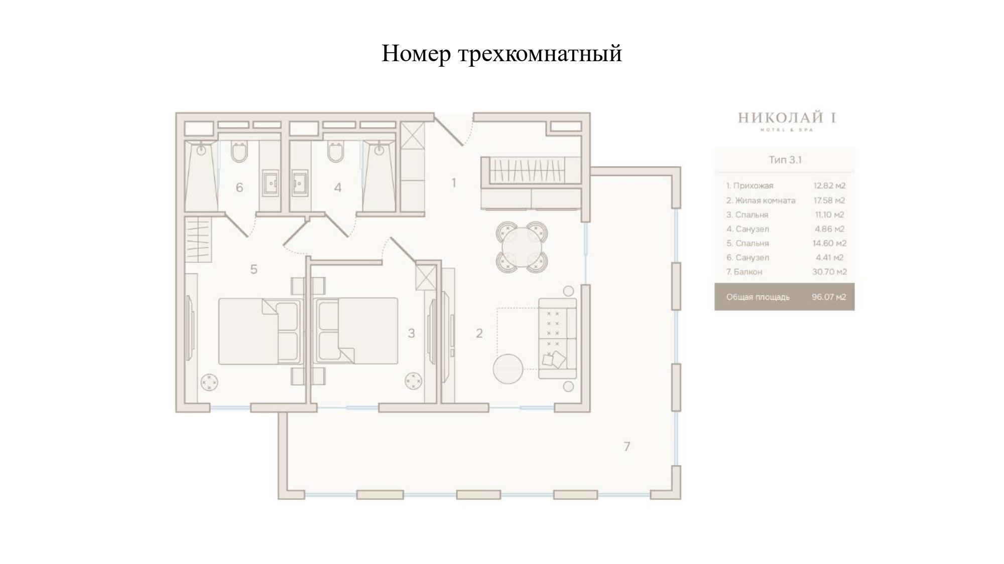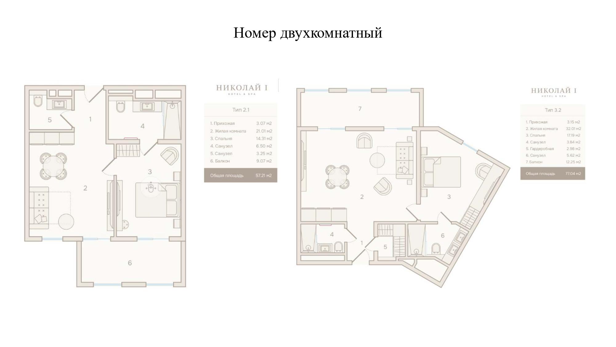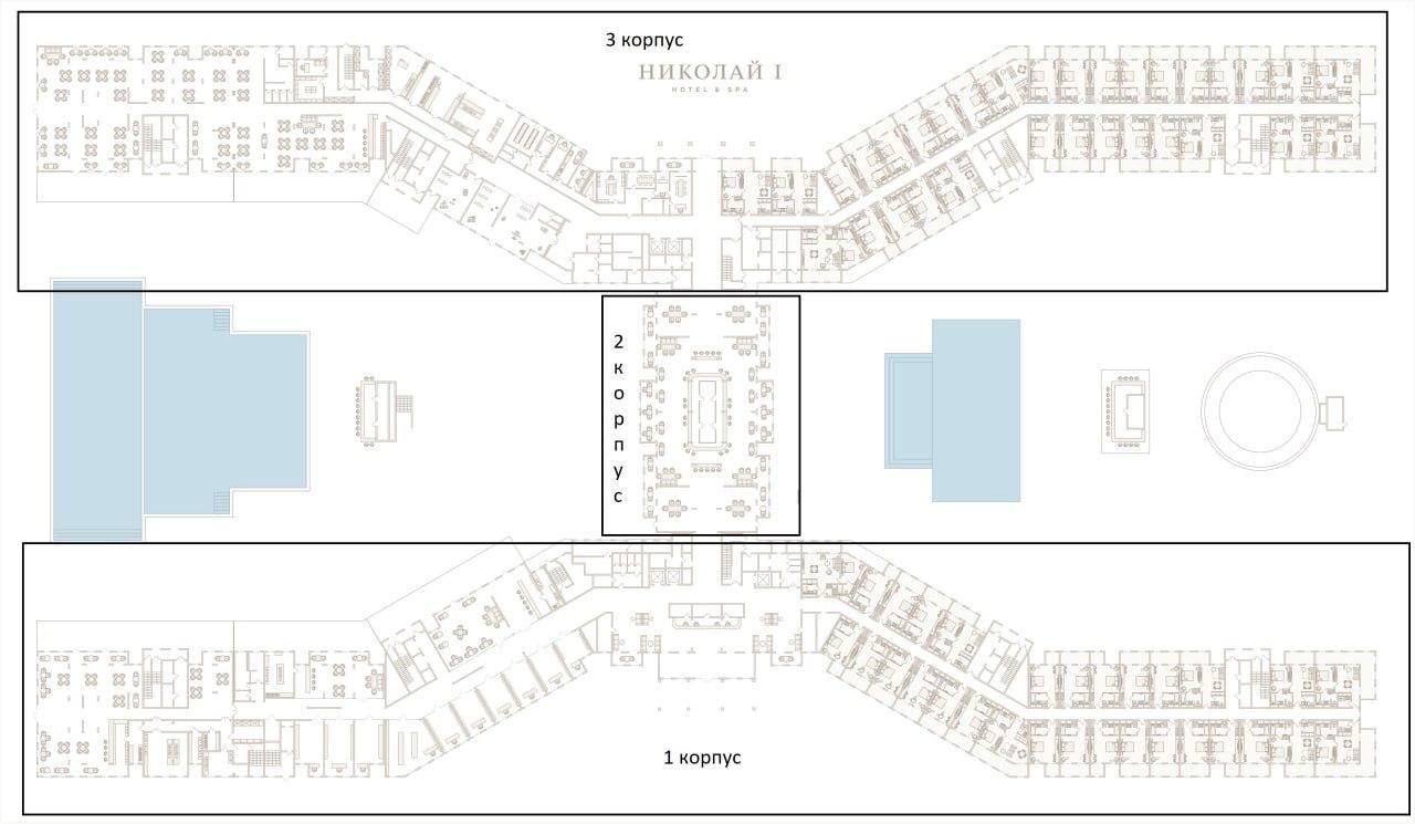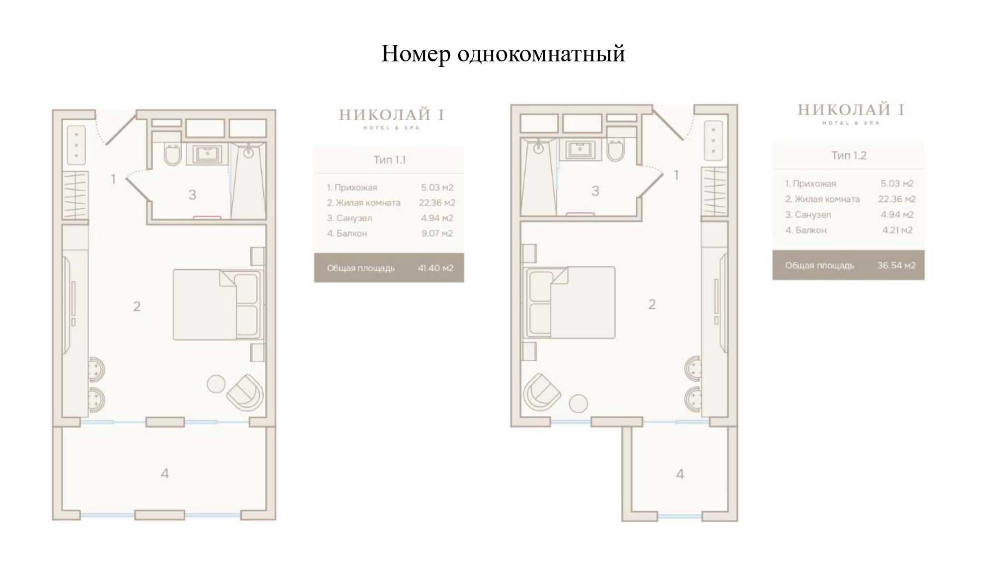 Отель "Николай I" рассчитан на 624 номера площадью от 36,5 до 158 кв.м. Каждый номер полностью готов к проживанию. Проектом предусмотрены дизайнерский ремонт, оборудование бытовой техникой, предметами мебели и прочими аксессуарами (вплоть до посуды), необходимыми для комфортного проживания и отдыха.