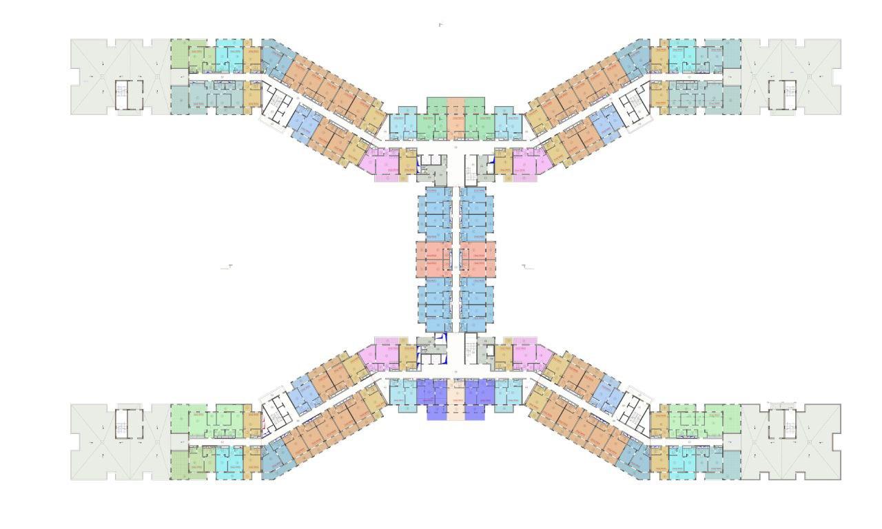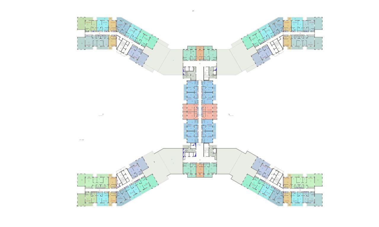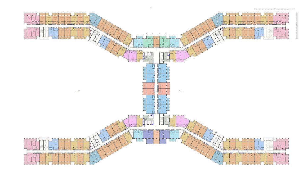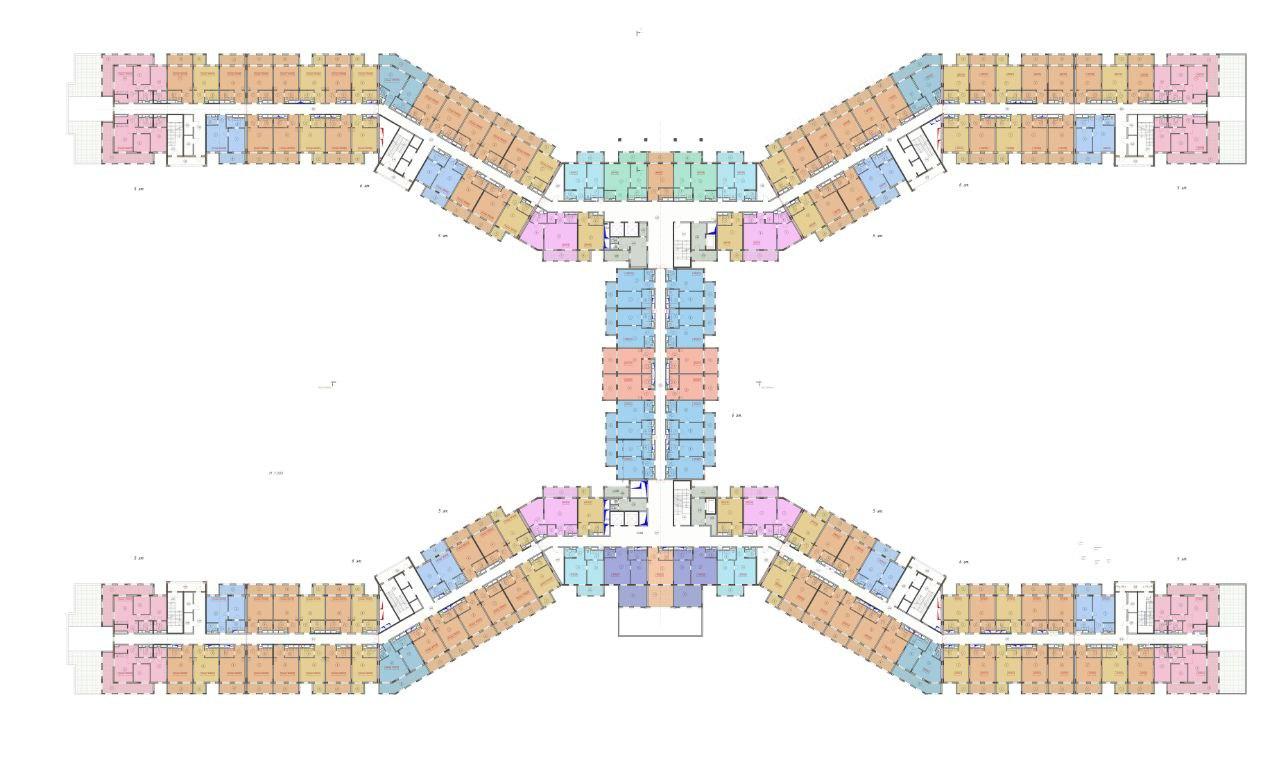 Расположение номеров - коридорного типа. Проектом предусмотрены дизайнерские пассажирские лифты с премиальной отделкой для постояльцев отеля и сервисные лифты для персонала.