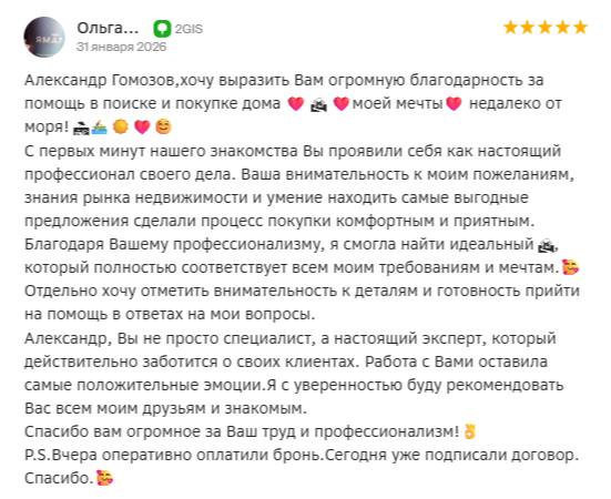 ЗаботаАлександр Гомозов, хочу выразить Вам огромную благодарность за помощь в поиске и покупке дома моей мечты недалеко от моря!