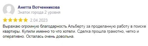 Выражаю огромную благодарность Альберту за проделанную работу в поиске квартиры. Купили именно то, что хотели.