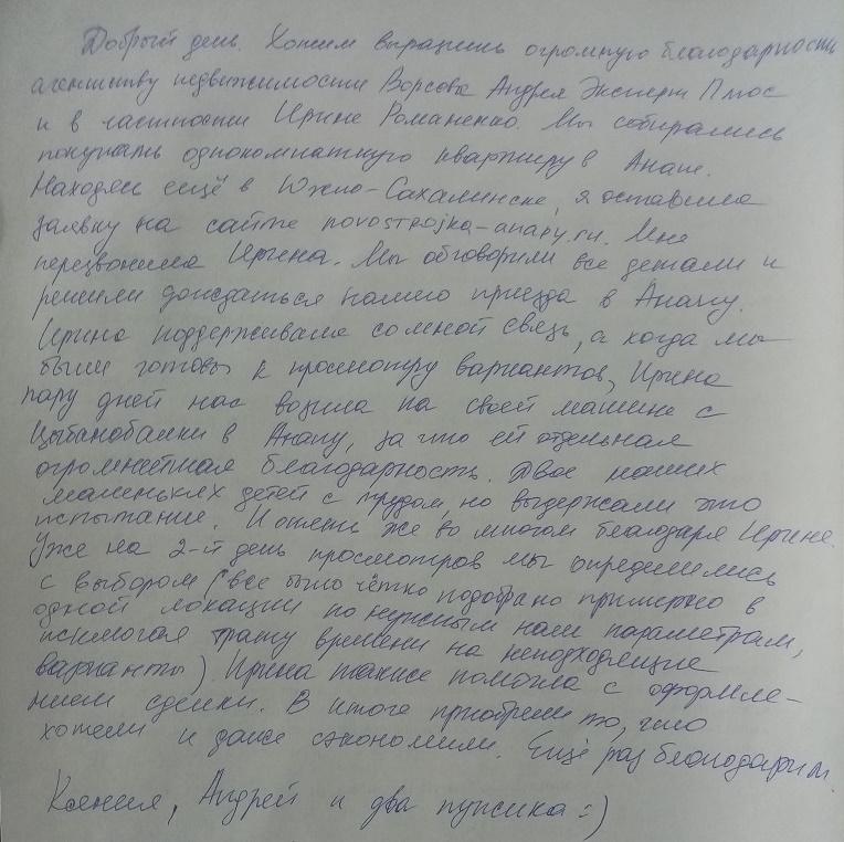 Ирина поддерживала со мной связь, а когда мы были готовы к просмотру вариантов, Ирина пару дней нас возила на своей машине с Цибанобалки в Анапу, за что ей отдельная огромнейшая благодарность. Двое наших маленьких детей с трудом, но выдержали это испытание. И опять же во многом благодаря Ирине. Уже на второй день просмотров мы определились с выбором (все было чётко подобрано примерно в одной локации по нужным нам параметрам, исключая трату времени на неподходящие варианты).