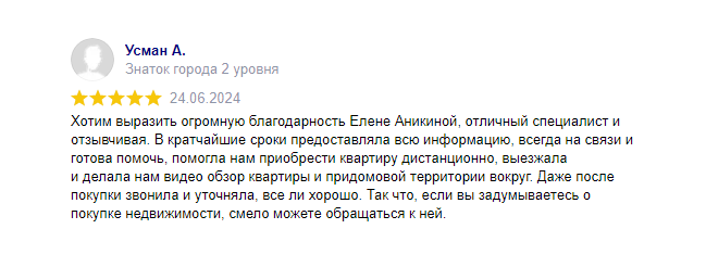 В кратчайшие сроки предоставляла всю информацию, всегда на связи и готова помочь, помогла нам приобрести квартиру дистанционно, выезжала и делала нам видео обзор квартиры и придомовой территории вокруг. Даже после покупки звонила и уточняла, всё ли хорошо.