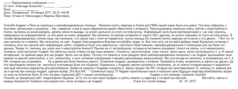 Поделились с Андреем своими мыслями и желаниями, он их слегка откорректировал и предложил нам ещё несколько вариантов для рассмотрения. Далее на машине с Андреем съездили в офисы продаж тех ЖК, которые нас заинтересовали. И, наконец то, взвесив все за и против при помощи Андрея, сделала выбор. Это был ЖК."Солнечный город" !!! Надели строительные каски и посетили свою будущую квартиру,полюбовались видом из окна на Анапскую бухту. В этот же день подписали ДДУ с нашим застройщиком.