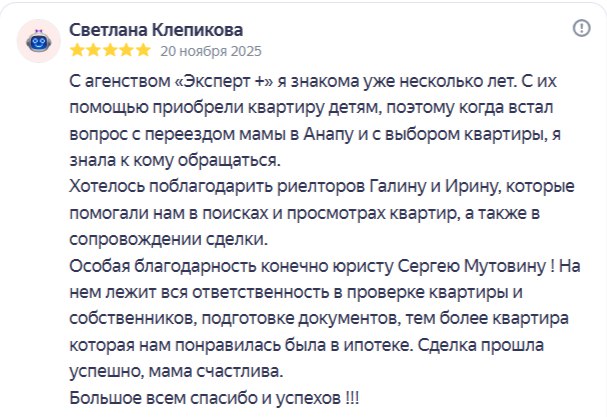 ЗаботаС агенством «Эксперт +» я знакома уже несколько лет. С их помощью приобрели квартиру детям, поэтому когда встал вопрос с переездом мамы в Анапу и с выбором квартиры, я знала к кому обращаться.
