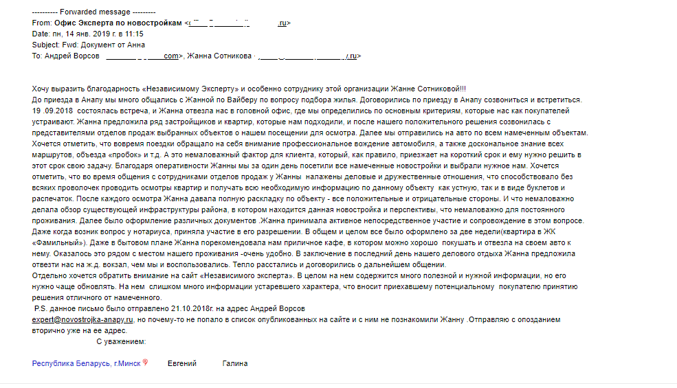 19 .09.2018 состоялась встреча, и Жанна отвезла нас в головной офис, где мы определились по основным критериям, которые нас как покупателей устраивают. Жанна предложила ряд застройщиков и квартир, которые нам подходили, и после нашего положительного решения созвонилась с представителями отделов продаж выбранных объектов о нашем посещении для осмотра. Далее мы отправились на авто по всем намеченным объектам. Хочется отметить, что вовремя поездки обращало на себя внимание профессиональное вождение автомобиля, а также доскональное знание всех маршрутов, объезда «пробок» и т.д. А это немаловажный фактор для клиента, который, как правило, приезжает на короткий срок и ему нужно решить в этот срок свою задачу. Благодаря оперативности Жанны мы за один день посетили все намеченные новостройки и выбрали нужное нам. Хочется отметить, что во время общения с сотрудниками отделов продаж у Жанны налажены деловые и дружественные отношения, что способствовало без всяких проволочек проводить осмотры квартир и получать всю необходимую информацию по данному объекту как устную, так и в виде буклетов и распечаток. После каждого осмотра Жанна давала полную раскладку по объекту - все положительные и отрицательные стороны. И что немаловажно делала обзор существующей инфраструктуры района, в котором находится данная новостройка и перспективы, что немаловажно для постоянного проживания. Далее было оформление различных документов .Жанна принимала активное непосредственное участие и сопровождение в этом вопросе. Даже когда возник вопрос у нотариуса, приняла участие в его разрешении. В общем и целом все было оформлено за две недели (квартира в ЖК «Фамильный»). Даже в бытовом плане Жанна порекомендовала нам приличное кафе, в котором можно хорошо покушать и отвезла на своем авто к нему. Оказалось это рядом с местом нашего проживания - очень удобно. В заключение в последний день нашего делового отдыха Жанна предложила отвезти нас на ж.д. вокзал, чем мы и воспользовались. Тепло расстались и договорились о дальнейшем общении.