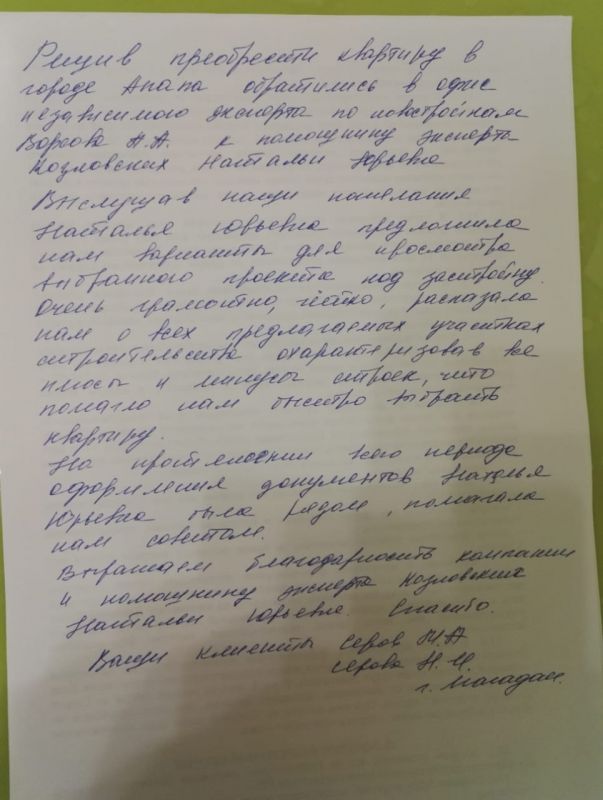 ЗаботаРешив приобрести квартиру в городе Анапа обратились в офис независимого эксперта по новостройкам Ворсова А.А. к помощнику эксперта Козловских Натальи Юрьевне.