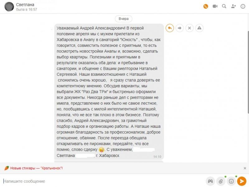 Уважаемый Андрей Александрович! В первой половине апреля мы с мужем прилетали из Хабаровска в Анапу в санаторий "Юность" , чтобы, как говорится, совместить полезное с приятным, то есть посмотреть новостройки Анапы и, возможно, сделать выбор квартиры. Полезными и приятными в результате оказались оба дела: и пребывание в санатории, и общение с Вашим риелтором Натальей Сергеевой. Наши взаимоотношения с Наташей сложились очень хорошо, я сразу стала доверять ее компетентному мнению. Обсудив варианты, мы выбрали ЖК "Раз Два ТРи" и быстренько оформили все документы. Никогда раньше дел с риелторами не имела, представление о них было не самое лестное, но, пообщавшись с милой интеллигентной Наташей, поняла, что не все так плохо в этом бизнесе. Поэтому спасибо, Андрей Александрович, за грамотный подбор кадров и организацию работы. А Наташе наша огромная благодарность за профессионализм, доброе отношение, обаяние. После переезда обещала откармливать ее пирожками, передайте, что все помню, слово сдержу