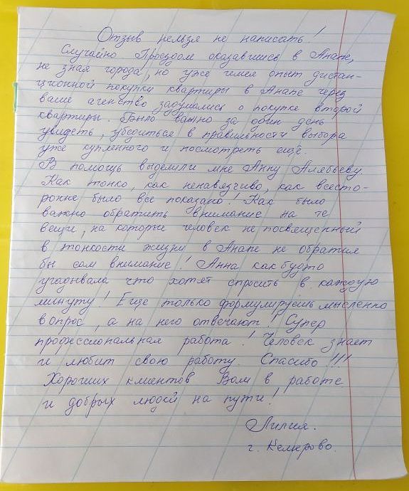 Случайно Проездом оказавшись в Анапе, не зная города, но уже имея опыт дистанционной покупки квартиры в Анапе через ваше агентство, задумались о покупке второй квартиры. Было важно за один день увидеть, убедиться в правильности выбора уже купленного и посмотреть еще. В помощь выделили мне Анну Алябьеву. Как тонко, как ненавязчиво, как всесторонне было все показано! Как было важно обратить внимание на те вещи, на которые человек не посвященный в тонкости жизни в Анапе не обратил бы сам внимания! Анна как будто угадывала что хотят спросить в каждую минуту! Еще только формируешь мысленно вопрос, а на него отвечают! Супер профессиональная работа! Человек знает и любит свою работу. Спасибо!!! Хороших клиентов Вам в работе и добрых людей на пути!