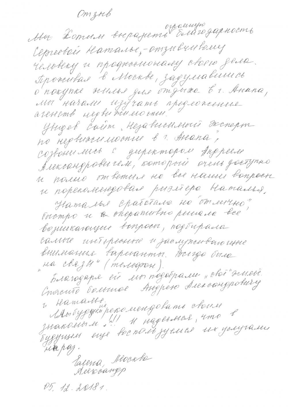 Мы хотим выразить огромную благодарность Сергеевой Наталье – отзывчивому человеку и профессионалу своего дела. Проживая в Москве, задумавшись о покупке жилья для отдыха в г. Анапа, мы начали изучать предложения агентств недвижимости.