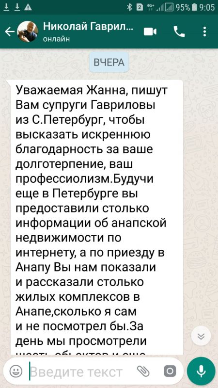 За день мы просмотрели шесть обьектов и еще на следующий день два. Жена тоже вам благодарна. Будем рекомендовать вас друзьям как специалиста по выбору анапской недвижимости и просто как внимательного человека. С уважением супруги Гавриловы Николай и Катерина из Сант-Петербурга.